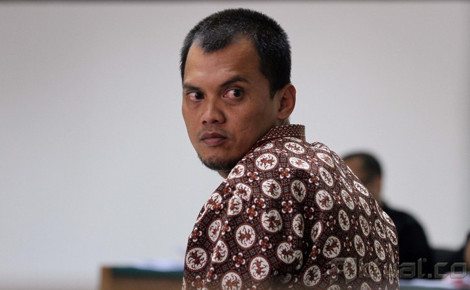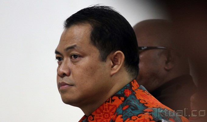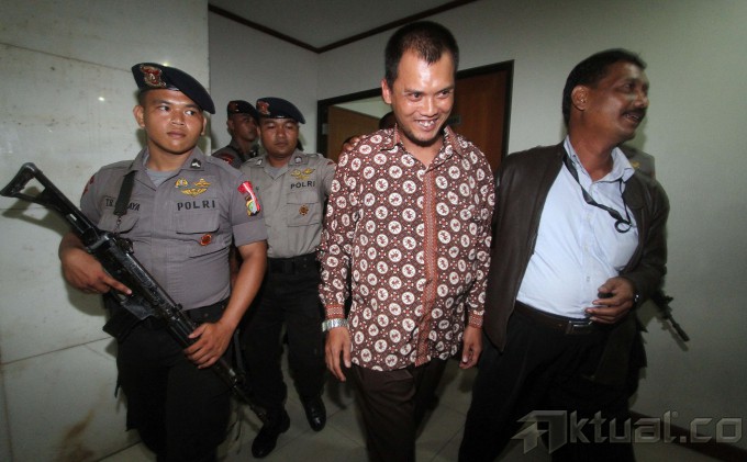 Saksi Miko Panji Tirtayasa dikawal Brimob saat akan menjadi saksi di pengadilan kasus suap mantan Ketua MK Akil Mochtar, di Pengadilan Tindak Pidana Korupsi (Tipikor), Jakarta, Senin (7/4/2014). Miko mengakui pernah mengantar dua kardus berisi uang pecahan seratus ribu ke rumah dinas mantan Ketua Mahkamah Konstitusi Akil Mochtar di Kompleks Widya Chandra, Jakarta Selatan. Awalnya, Miko yang merupakan supir dan asisten pribadi Muhtar Ependi, menampik mengetahui penyerahan uang tersebut. Namun, setelah diajukan beberapa pertanyaan akhirnya dia mengakuinya. Aktual/Tino Oktaviano