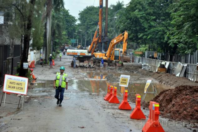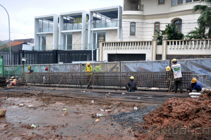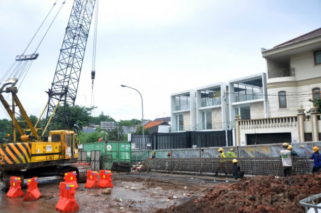 Pekerja melakukan pembangunan jalan layang (Flyover) di sekitar Jalan Permata Hijau, Jakarta, Senin (2/3/2015). Flyover Permata Hijau dibangun karena kondisi persimpangan ini dengan Patal Senayan selalu padat dengan berbagai kendaraan, termasuk adanya lintasan kereta. Pembangunan ini diperkirakan rampung akhir 2015. AKTUAL/JUNAIDI MAHBUB