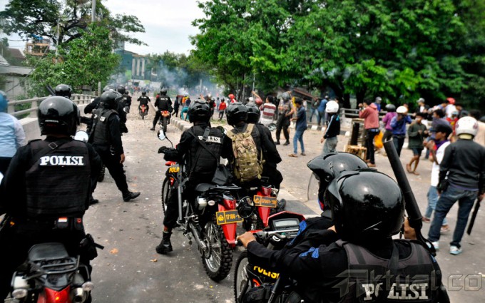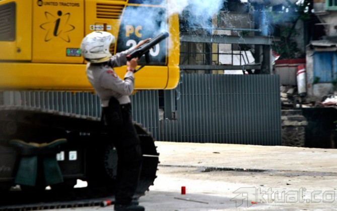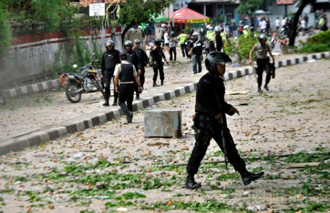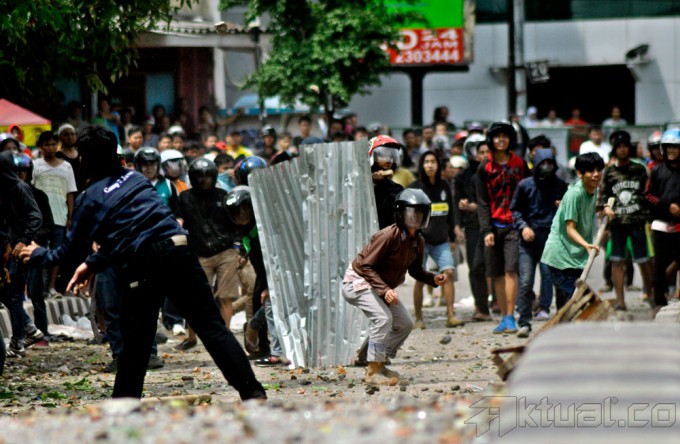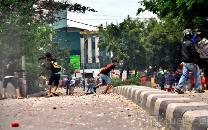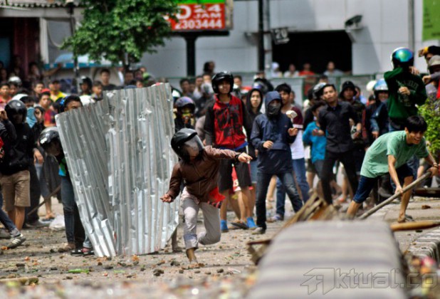 Suasana tawuran pemuda kembali pecah di Jalan Tambak, Manggarai, Jakarta Selatan, Minggu (30/11/2014). Tawuran tersebut melibatkan puluhan orang antara warga Tambak dan warga Manggarai Jakarta, hanya karena hal sepele, yakni saling ejek. AKTUAL/MUNZIR