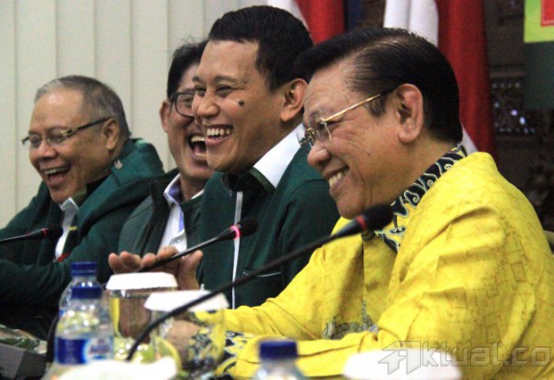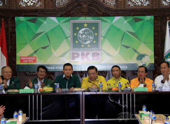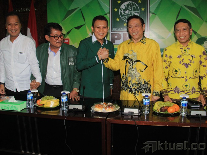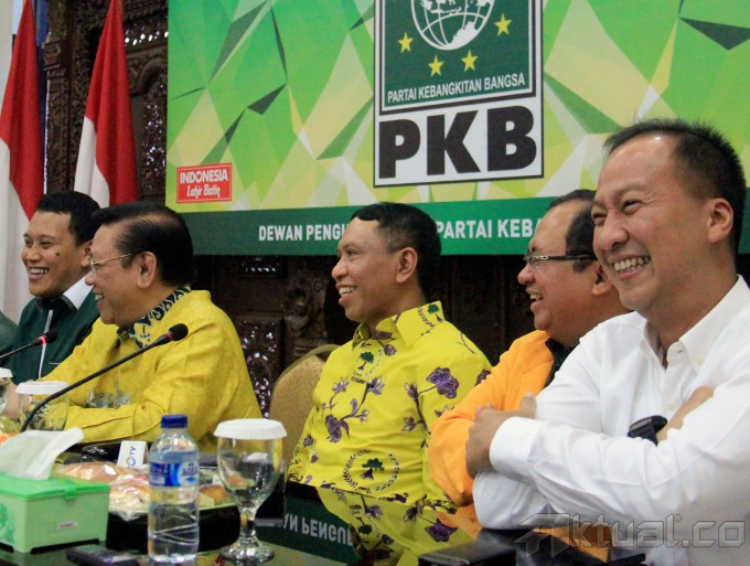 Wakil Bendahara DPP PKB Bahrudin Anshori, Wakil Ketua Dewan Suro DPP PKB Andi Muawiyah Ramli, Sekjen DPP PKB Kadir Kardin, Ketua Umum Partai Golkar Agung Laksono, Sekjen Partai Golkar Zainudin Amali, Wakil Ketua Umum Partai Golkar Priyo Budi Santoso, Ketua Fraksi Partai Golkar Agus Gumiwang saat duduk bersama dalam rangka safari politik Partai Golkar Munas Ancol di DPP PKB, Jakarta, Rabu (18/3/2015). Dalam pertemuan tersebut Agung Laksono dan Kadir Kardin berjabat tangan salam komando. AKTUAL/MUNZIR