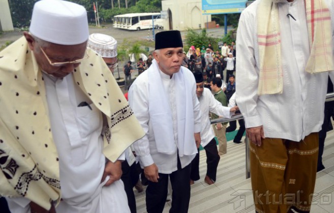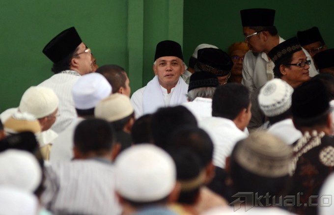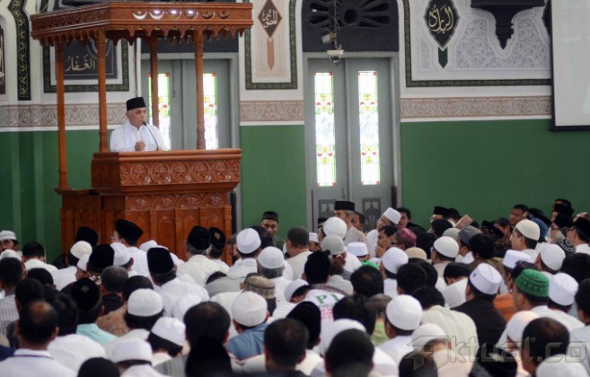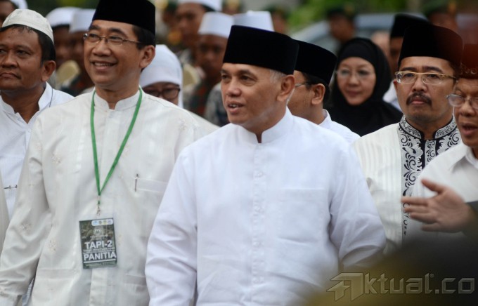 Calon Wakil Presiden dari Koalisi Merah Putih, Hatta Rajasa menghadiri peringatan Isra Miraj di Kompleks Masjid Al Azhar, Jakarta Selatan, Selasa (27/5/2014). Hatta yang berpasangan dengan Prabowo Subianto diusung oleh Partai Gerindra, PAN, PPP, PKS, Golkar, dan PBB. Aktual/Tino Oktaviano