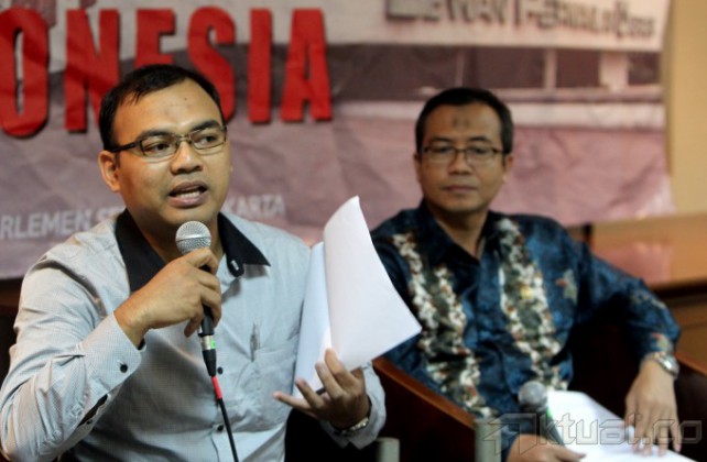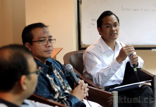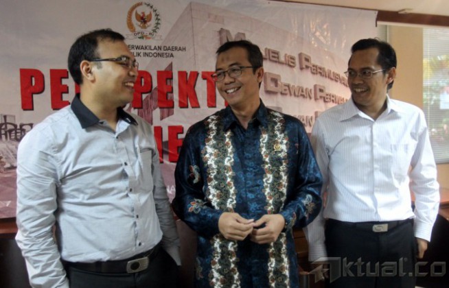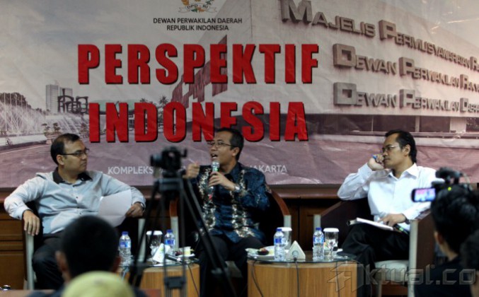 (kiri-kanan) Direktur Eksekutif IndoStrategi Andar Nubowo, Anggota DPD RI asal Lampung Ahmad Jajuli dan Peneliti LIPI Ahmad Najib Burhani menjadi pembicara pada diskusi dengan tema “Peta Politik di Senayan Pasca Pemilu Legislatif” di Gedung Parlemen, Jakarta, Jumat (25/4/2014). Aktual/Tino Oktaviano