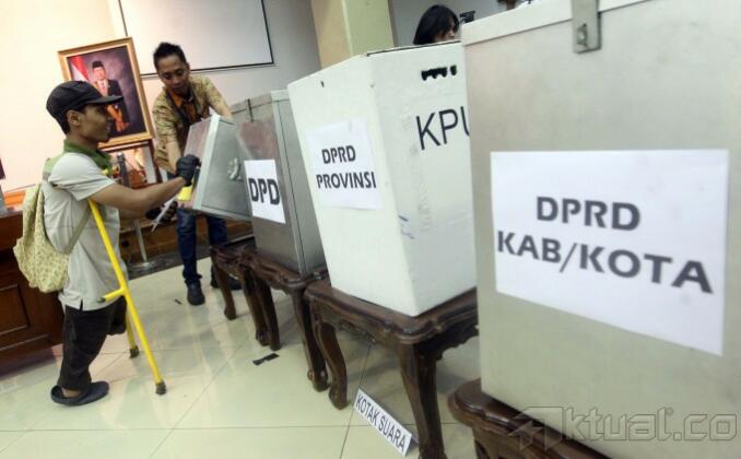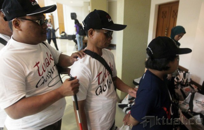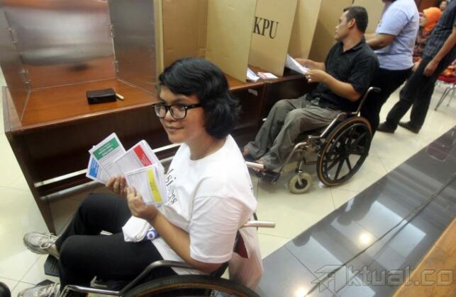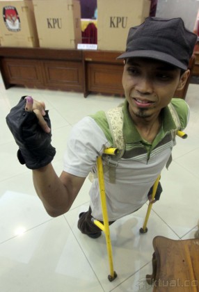 Penyandang disabilitas mengikuti “Sosialisasi dan Simulasi untuk Pemilih Disabilitas Pemilu 2014” di gedung Komisi Pemilihan Umum, Jakarta Pusat, Jumat (4/4/2014). Acara yang digelar KPU bersama Pusat Pemilihan Umum Akses Penyandang Cacat (PPUA Penca) itu bertujuan untuk memberi pemahaman lebih bagi pemilih yang menyandang disabilitas saat pencoblosan pada Pemilu mendatang. Aktual/Tino Oktaviano