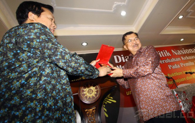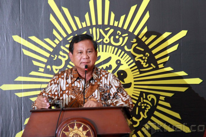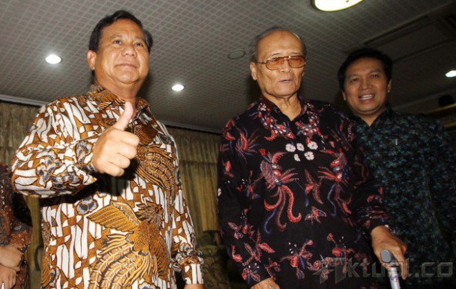 Calon presiden dari Partai Gerindra Prabowo Subianto berbincang dengan Mantan Ketua Umum Pimpinan Pusat Muhammadiyah Ahmad Syafii Maarif saat akan menjadi salah satu pembicara dalam acara dialog yang diselenggarakan oleh PP Muhammadiyah di Jakarta, Rabu (2/4/2014). Dalam pidatonya, Prabowo mengisyaratkan bahwa negara harus mendengarkan suara Muhammadiyah dan juga NU. Aktual/Tino Oktaviano