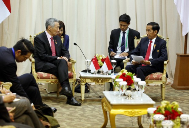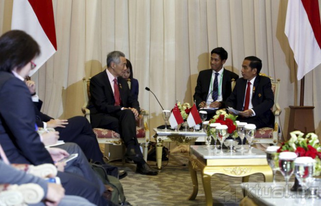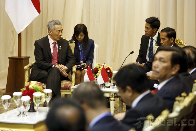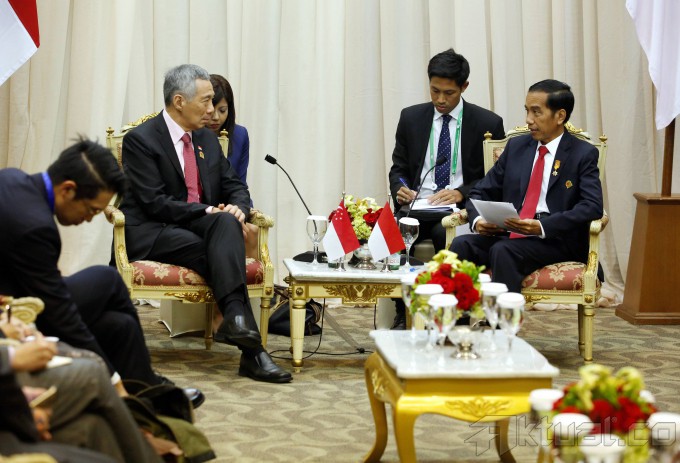 Perdana Menteri Singapura Lee Hsien Loong (kiri) berbincang dengan presiden Indonesia Joko Widodo (kanan) saat melakukan pertemuan bilateral di sela-sela penyelenggaraan KTT Asia Africa 2015 di Jakarta Convention Center, Rabu (22/4). aacc2015/Jerry Adiguna