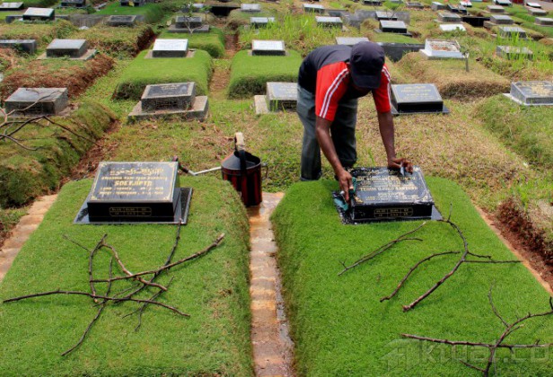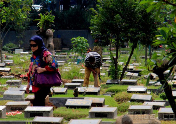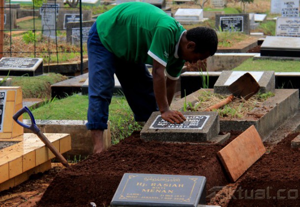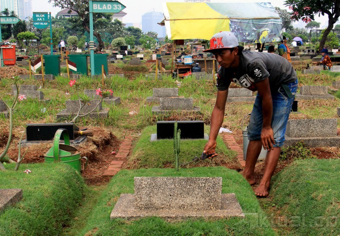 Seorang penjaga pemakaman mencuci batu nisan di TPU Karet Bivak, Tanah Abang, Jakarta Pusat, Kamis (4/6/2015). Menjelang datangnya bulan suci Ramadhan 1436 Hijriah, umumnya masyarakat muslim melakukan tradisi membersihkan makam sanak, kerabat, dan leluhur yang telah berpulang ke Rahmatullah. AKTUAL/MUNZIR