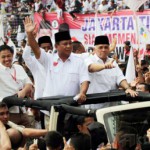 Capres Prabowo Subianto dan Cawapres Hatta Rajasa saat memimpin kampanye di Stadion Utama Gelora Bung Karno (SUGBK), Senayan, Jakarta, Minggu (22/6/2014). Selain dihadiri Pimpinan Partai Koalisi Merah-Putih, kampanye tersebut juga dihadiri mantan istri Prabowo, Titik Soeharto dan menantu Hatta Rajasa yang juga Sekjen Partai Demokrat, Edhie Baskoro Yudhoyono (Ibas). Aktual/Tino Oktaviano
