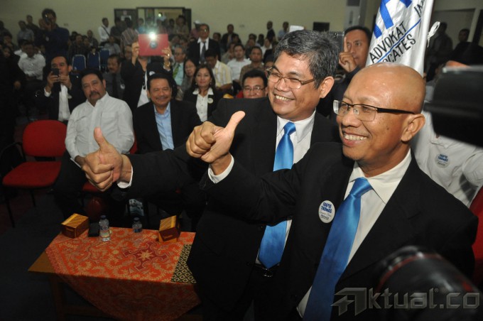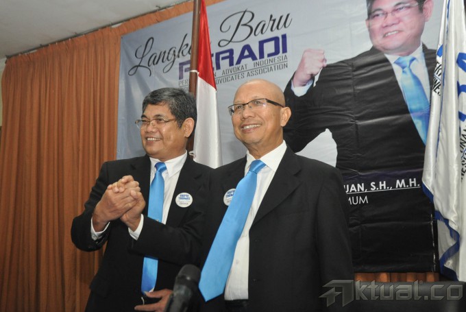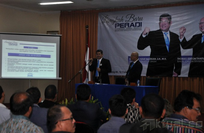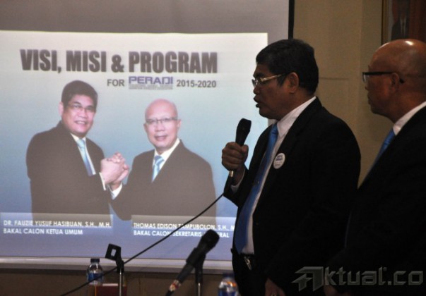 Fauzie Yusuf Hasibuan (kiri) dan Thomas Edison Tampubolon (kanan) mendeklarasikan diri sebagai bakal calon ketua umum dan sekertaris jendral Perhimpunan Advokat Indonesia (Peradi) periode 2015-2020 di Jakarta, Kamis (12/2/2015). Dalam acara deklarasi tersebut mereka memaparkan visi dan misi untuk mewujudkan advokat yang berkualitas, bermartabat untuk masyarakat demi tegaknya hukum dan keadilan. AKTUAL/JUNAIDI MAHBUB
