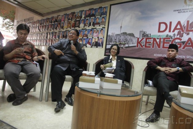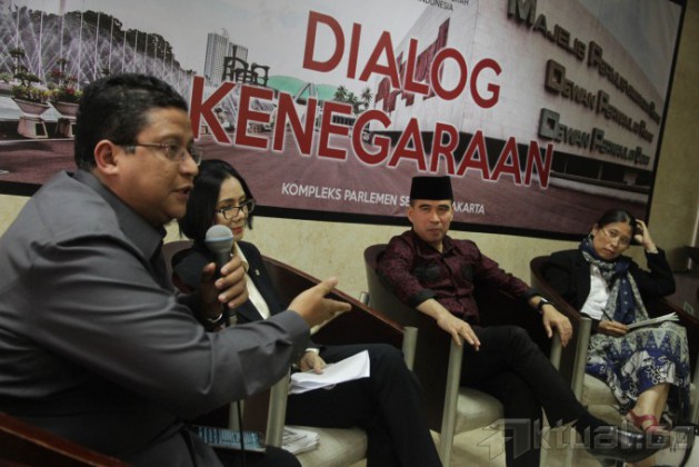 Dari kiri ke kanan, Kordinator Badan Pekerja Indonesia Indonesia Corruption Watch (ICW) Ade Irawan, Ketua Badan Pengawas Pemilu (Bawaslu) Muhammad, Anggota DPD Dapil Jawa Tengah/Penggugat Hasil Pileg 2014 Poppy Dharsono, dan Ketua Komite I DPD Dewan Perwakilan Daerah (DPD) RI asal Sumatera Barat Alirman Sori menjadi pembicara dalam diskusi “Dialog Kenegaraan” di Gedung Parlemen Senayan, Jakarta, Rabu (14/5/2014). Mereka menyoroti seputar potensi sengketa Pemilu Legislatif 2014 pasca pengumuman hasil Rekapitulasi Nasional oleh KPU serta dihubungkan dengan banyaknya pengaduan dan pengajuaan gugatan caleg ke Mahkamah Konstitusi (MK) atas pelanggaran yang terjadi di sejumlah daerah. Aktual/Tino Oktaviano