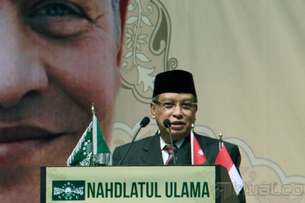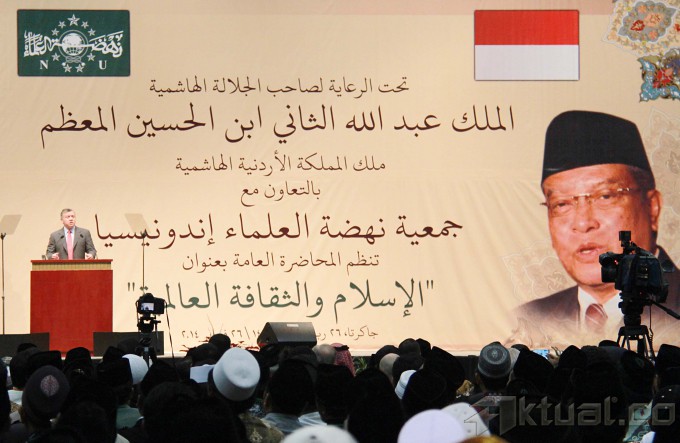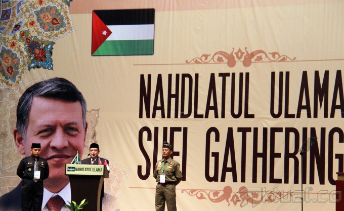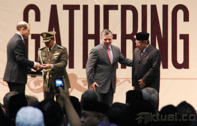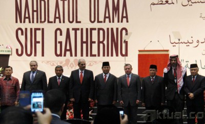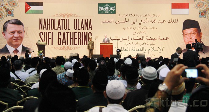 Ketua Umum PBNU KH Said Aqil Siroj dan Raja Yordania Raja Abdullah II, foto bersama Sahabat Raja Yordania Prabowo Subiyanto, Jusuf Kalla, M Nuh dan Din Syamsudin saat acara Forum Multaqa Sufi atau Nahdlatul Ulama Sufi Gathering yang diselenggarakan JCC Senayan, Jakarta, Rabu (26/2/2014). Dalam sambutannya Ketua PBNU menucapkan selamat datang kepada Raja Yordania ke Indonesia yang memiliki kekayaan alam luar biasa dan kearifan manusianya yang menjadi perhatian dunia dengan aneka macam suku, bahasa, dan kepercayaan tidak membuat mereka berpecah belah. Kami diikat oleh Pancasila yang dirumuskan dari kearifan intelektual tiap bangsa di negeri ini. Aktual/Tino Oktaviano