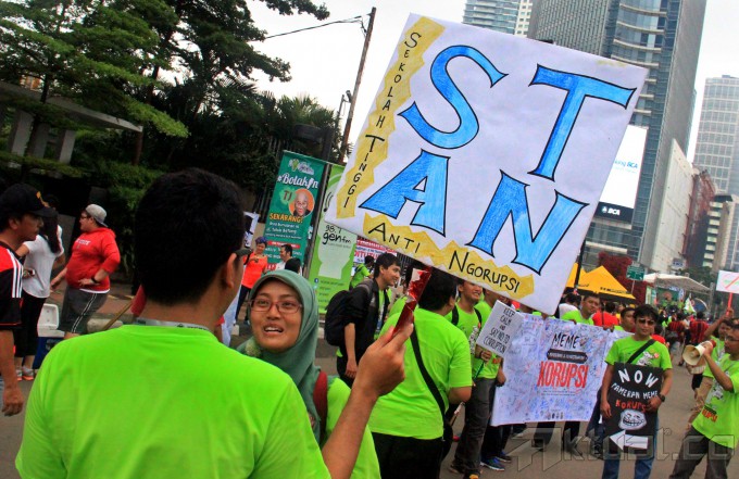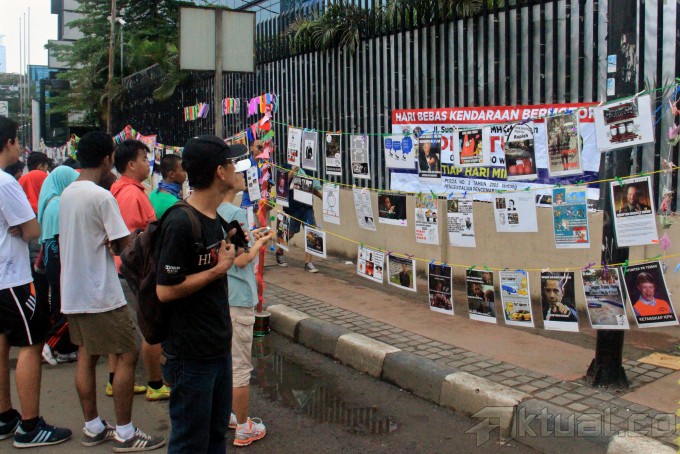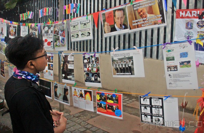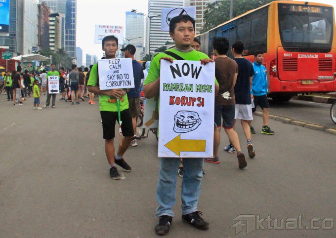 Seorang warga melihat foto yang ditampilkan Para penggiat Anti Korupsi saat pameran photo meme, yang bertemakan Gerakan Anti Korupsi, acara yang di selenggarakan di Car Free Day, Jakarta, Minggu (18/1/2015). Sekitar 50 gambar serta epsan Gerakan Anti Korupsi tersebut merupakan para nominasi yang masuk dalam kompetisi kampanye anti korupsi. AKTUAL/MUNZIR