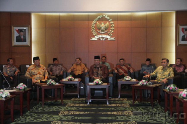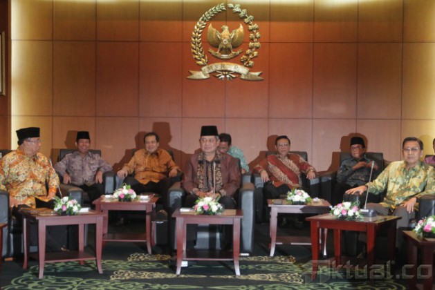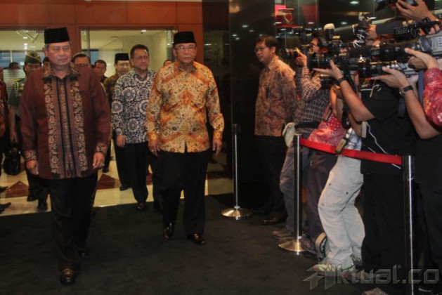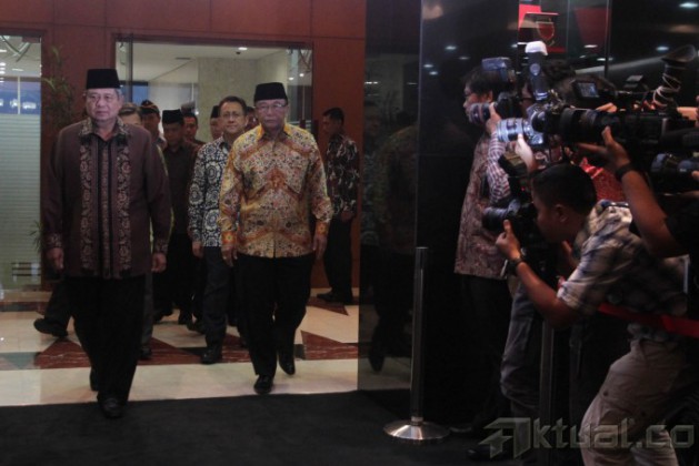 Presiden Susilo Bambang Yudhoyono (kanan depan), dan Ketua MPR Sidharto Danusubroto (kiri depan), beserta sejumlah menteri kabinet Indonesia Bersatu II menghadiri pertemuan pimpinan lembaga tinggi negara di Kompleks Parlemen, Senayan, Jakarta, Senin (7/7/2014). Pertemuan yang dihadiri pimpinan lembaga-lembaga tinggi negara itu antara lain mengagendakan pembahasan tentang konsolidasi lembaga negara terkait berlangsungnya Pemilu Presiden 2014. Aktual/Tino Oktaviano