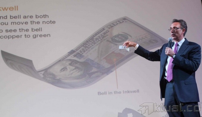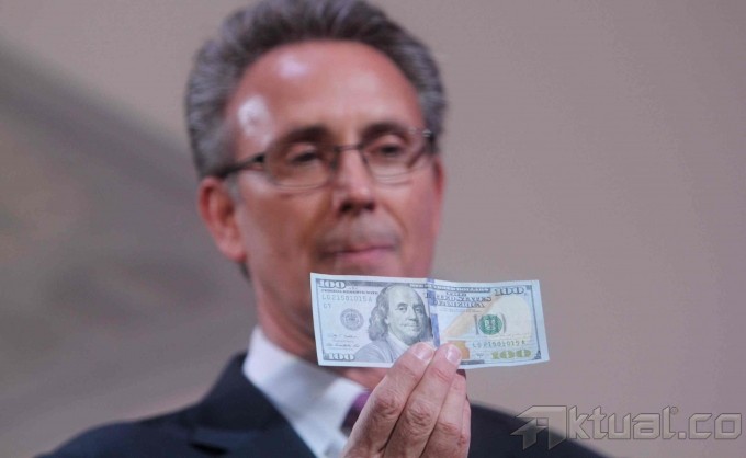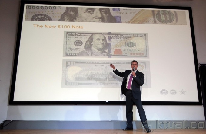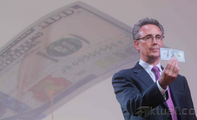 Direktur Bidang Uang Kertas – Dewan Gubernur Sistem Cadangan Federal Amerika Serikat (AS) Michael J Lambert memperlihatkan pecahan uang Dolar AS yang baru saat mengelar jumpa pers spesifikasi uang kertas pecahan 100 dolar AS baru, di Jakarta, Rabu (23/10/2013). Cadangan Federal atau Bank Central Amerika Serikat mulai mengedarkan uang kertas pecahan 100 dolar AS ke lembaga-lembaga keuangan dunia pada 8 Oktober 2013, dengan desain dan sistem keamanan baru, jaminan keaslian serta anti-pemalsuan, yaitu pita keamanan 3D, gambar lonceng yang warnanya berubah-ubah dan tera air untuk membuktikan keaslian secara visual. Aktual/Tino Oktaviano