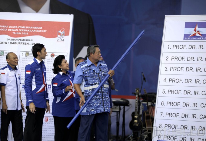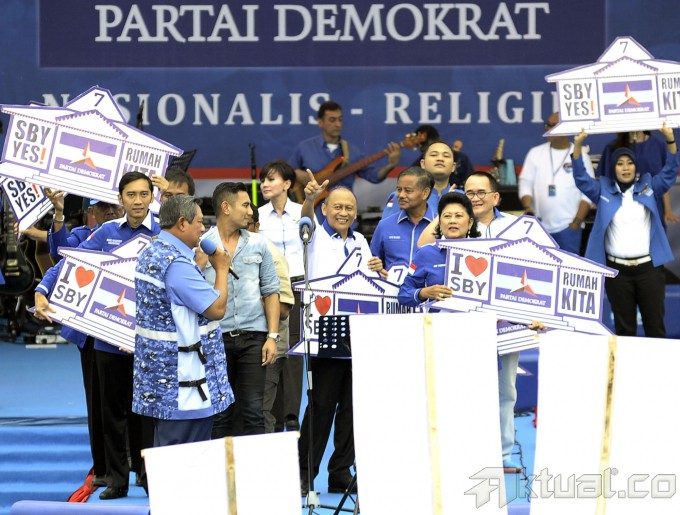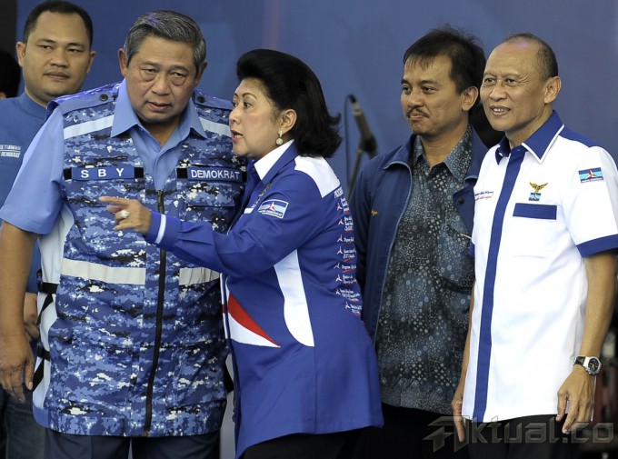 Ketua Dewan Pembina Partai Demokrat Susilo Bambang Yudhoyono bersama Ani Yudhoyono, Sekjen Partai Demokrat Edhie baskoro Yudhoyono dan peserta konvensi capres partai demokrat Pramono Edhie Wibowo saat melakukan kampanye terbuka hari kedua di lapangan Pendowoharjo Bantul, Jawa tengah, Senin (17/3/2014). Pada kampanye kali ini Presiden SBY yang juga Ketua Dewan Pembina Partai Demokrat bisa hadir setelah sehari sebelumnya di magelang berhalangan hadir. Aktual/Ist