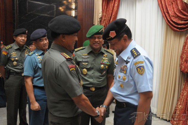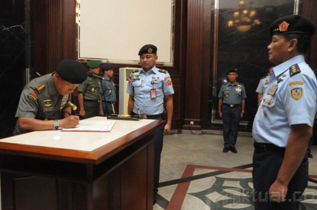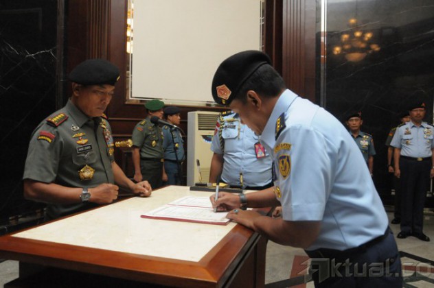 Panglima TNI Jenderal TNI Moeldoko menerima penyerahan tugas, wewenang dan tanggung jawab jabatan Kepala Staf Umum (Kasum) TNI dari Marsekal Madya (Marsdya) TNI Agus Supriatna yang saat ini menjabat Kepala Staf Angkatan Udara (Kasau), bertempat di Lobby Subden Denma Mabes TNI Jalan Medan Merdeka Barat, Jakarta Pusat, Senin (19/1/2015). Turut hadir dalam acara tersebut adalah Kasad, Kasal, Koorsahli Panglima TNI, Passuspom TNI, para Asisten Panglima TNI, Dankodiklat TNI, Kabais TNI, para Kabalakpus TNI, Pangdam Jaya dan Kapuspen TNI.AKTUAL/PUSPEN TNI