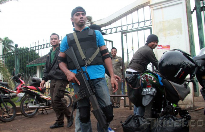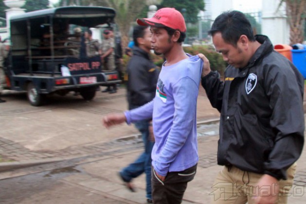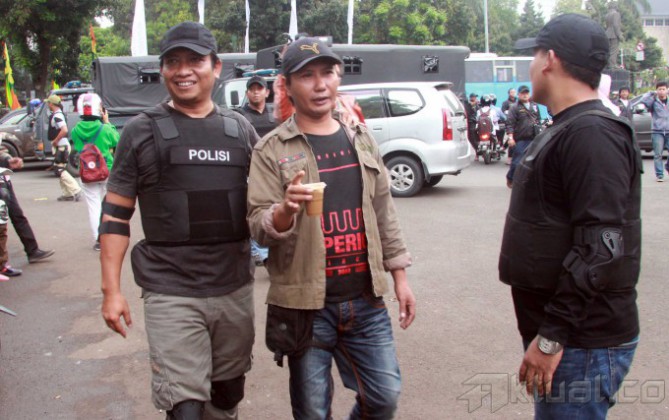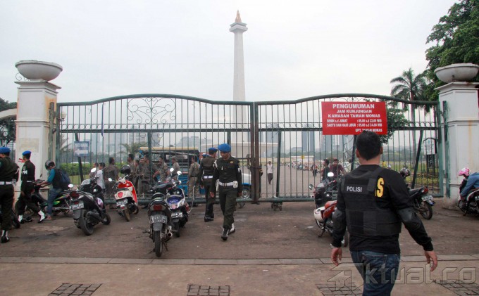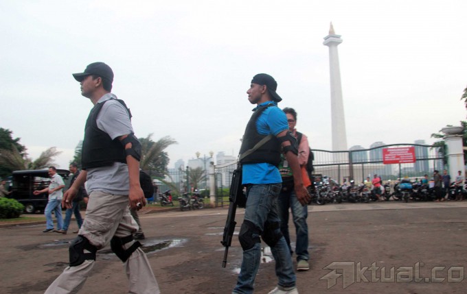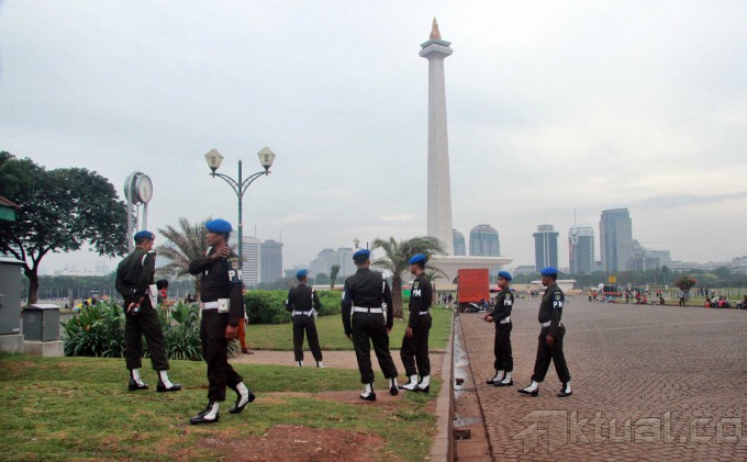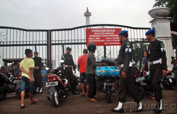Petugas Sub Direktorat Jatanras Direktorat Reserse Kriminal Umum Polda Metro Jaya dan Provost TNI Angkatan Darat mengamankan puluhan juru parkir liar yang beroperasi dikawasan Monas, Jakarta Pusat, Kamis (26/6/2014). Operasi tersebut diadakan akibat kejadian yang menimpa juru parkir Yusri (40), yang dibakar oleh oknum TNI berpangkat sersan satu berinisial H. Aktual/Tino oktaviano