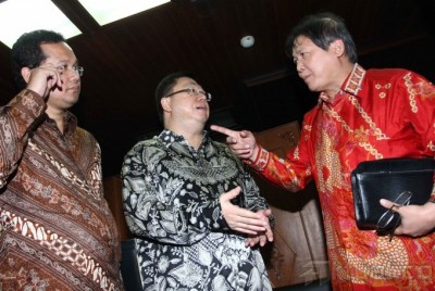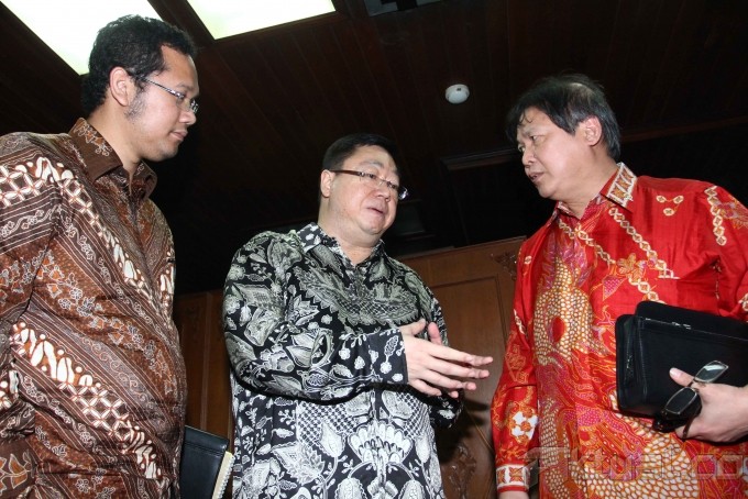 Terdakwa Kasus Bailout yang juga mantan pemilik Bank Century Robert Tantular (tengah) didampingi Kuasa Hukumnya Andi Simangunsong (kiri) berbincang dengan Anggota Timwas Century Fraksi PDIP Hendrawan Supratikno (kanan) sebelum mengikuti Rapat dengan Timwas Century DPR di Gedung Parlemen, Jakarta, Rabu (2/10/2013). Rapat yang sedianya akan mengkonfrontasi pendapat Robert Tantular dengan Budi Mulya, batal dilakukan terkait ketidakhadiran Budi Mulya untuk kedua kalinya karena alasan penetapan dirinya sebagai tersangka oleh KPK. Aktual/Tino Oktaviano