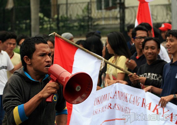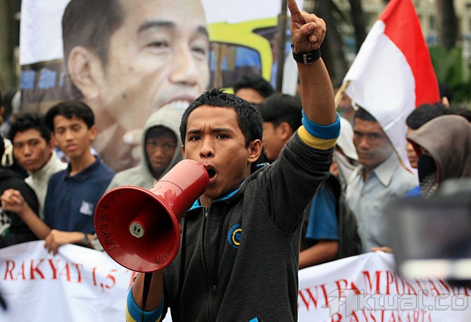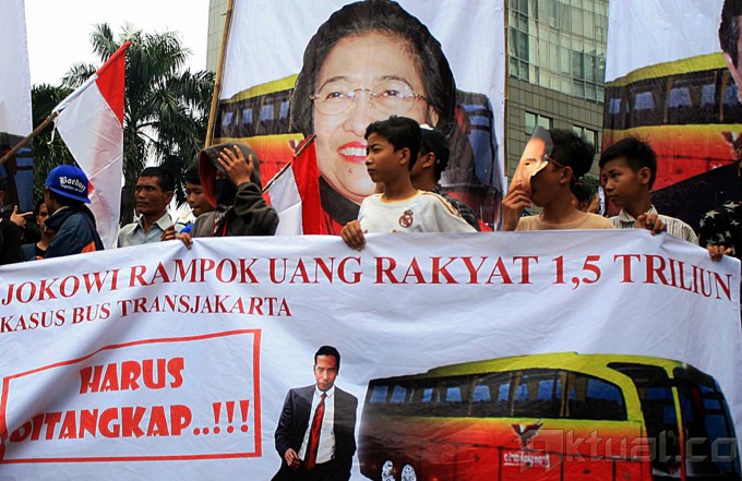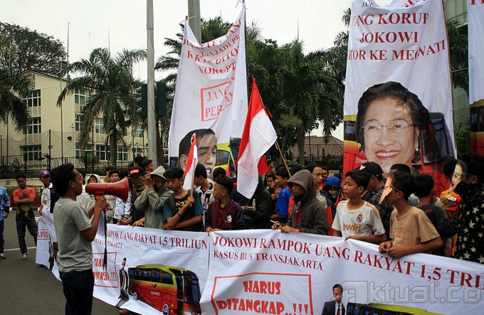Puluhan mahasiswa dari Gerakan Mahasiswa Indonesia Hebat (Gema Indonesia Hebat) membakar emosi saat aksi unjuk rasa mendesak Kejaksaan Agung segera menetapkan Joko Widodo sebagai tersangka terkait kasus korupsi pengadaan Bus Transjakarta di Bundaran Hotel Indonesia, Jakarta. Jumat (27/6/2014). Gema Indonesia Hebat mendesak kejaksaan agung membongkar kasus korupsi transjakarta yang dituduhkan kepada Gubernur DKI Jakarta Joko Widodo. Aktual/Tino Oktaviano