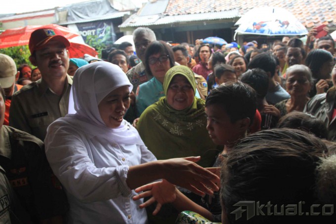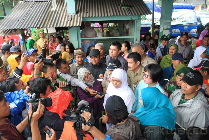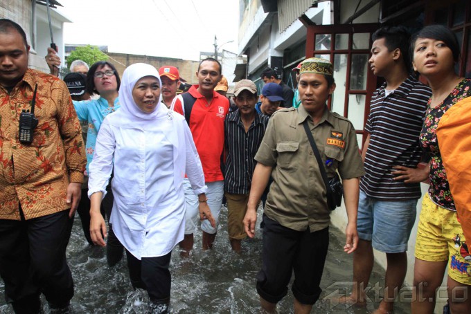 Menteri Sosial Khofifah Indar Parawansa, saat mengunjungi daerah terdampak banjir di Kelurahan Kapuk, Kecamatan Cengkareng, Jakarta Barat, Rabu (11/2/2015). Selain mendatangi lokasi pengungsian dan pemukiman warga yang terendam, Mensos juga menyerahkan bantuan berupa 1000 lembar selimut dan ratusan paket bahan peralatan keluarga serta kebutuhan anak. AKTUAL/JUNAIDI MAHBUB