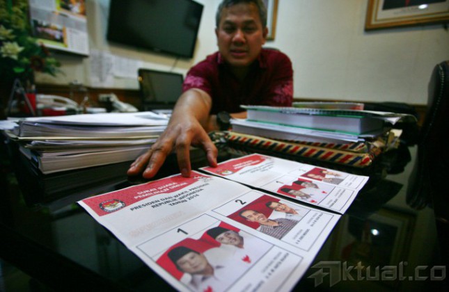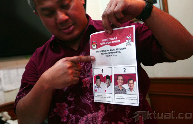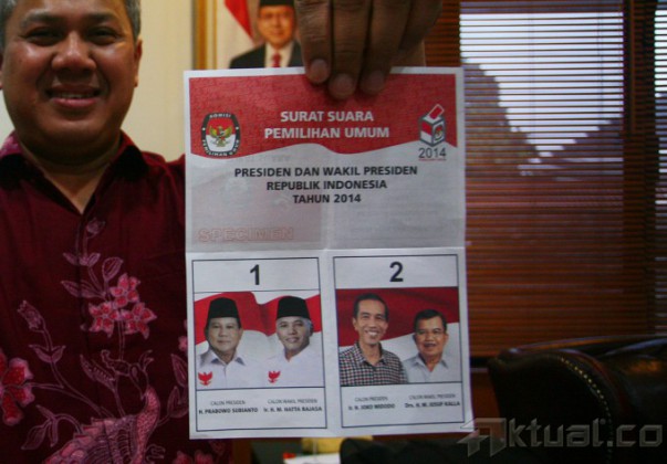 Anggota komisioner Komisi Pemilihan Umum (KPU), Arief Budiman menunjukkan contoh desain kertas suara yang telah disetujui dan ditandatangani oleh dua tim pasangan capres dan cawapres di Gedung KPU, Jakarta, Jumat (6/6/2014). Surat suara yang berukuran 18 x 23 cm tersebut menampilkan dua pasangan capres dan cawapres Prabowo Subianto-Hatta Rajasa dan Jokowi-Jusuf Kall, yang akan segera dicetak minggu ini. Aktual/Tino Oktaviano