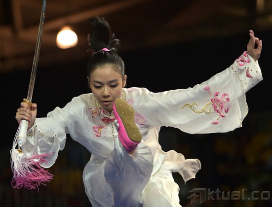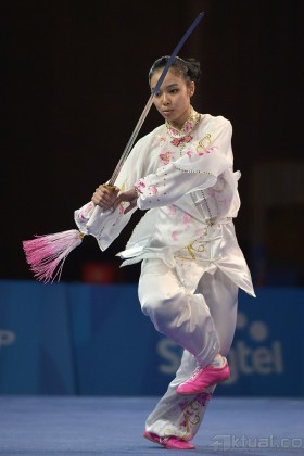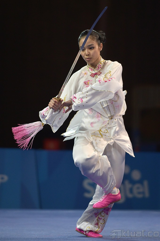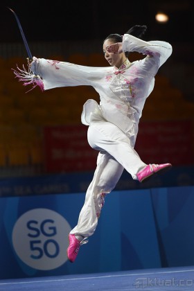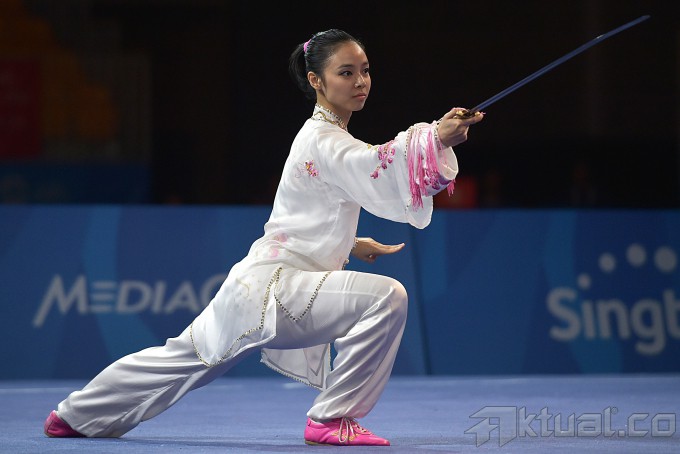 Atlet Wushu Indonesia Lindswell beraksi memperagakan jurus saat bertanding pada nomor Taijijian putri Sea Games ke-28 di Expo Hall Singapura, Senin (8/6). Lindswell berhasil meraih medali emas setelah meraih angka 9,73. ANTARA FOTO/Nyoman Budhiana