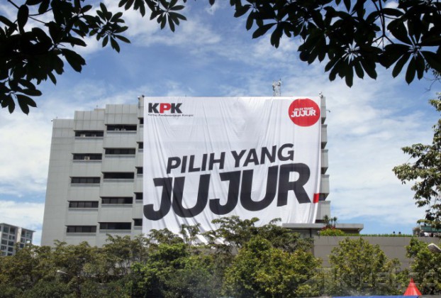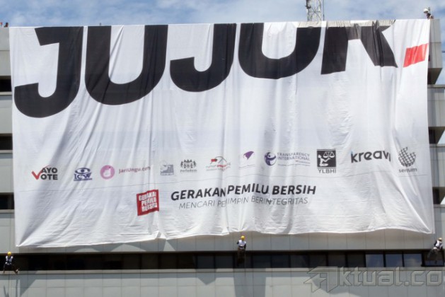 Pemanjat dari Federasi Panjat Tebing Indonesia memasang spanduk raksasa bertuliskan Pilih Yang Jujur di Gedung KPK Jakarta, Selasa (8/4/2014). Spanduk berukuran 22×22 meter itu sebagai bentuk kampanye KPK kepada masyarakat untuk menggunakan hak suaranya secara jujur dalam memilih calon yang jujur pada Pileg dan Pilpres 2014. Aktual/Tino Oktaviano