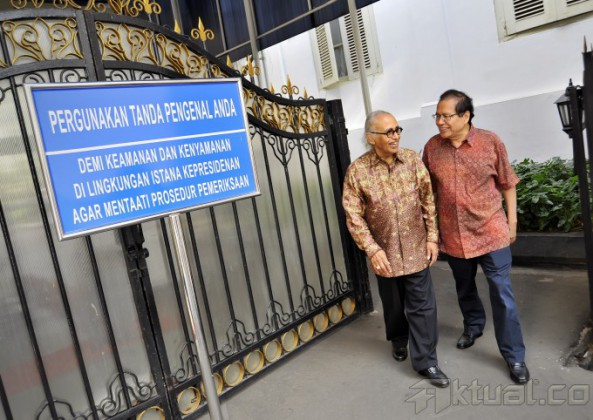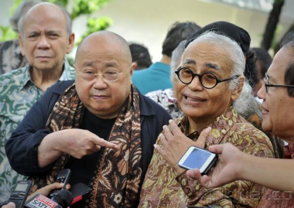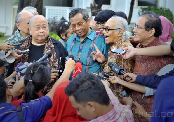 Pengamat Militer Salim Said (tengah) bersama (dari kiri-kanan) Wartawan Senior Daud Sinjal, Budayawan Jaya Suprana, Romo Sandiawan Sumardi serta Ekonom Rizal Ramli yang tergabung dalam Paguyuban Punakawan memberikan keterangan kepada wartawan usai bertemu Presiden Joko Widodo di Istana Negara, Jakarta, Kamis (4/6). Pertemuan dengan tokoh berbagai latar belakang itu membicarakan masalah aktual bidang politik, pemerintahan, sosial budaya, serta bidang hukum sebagai masukan untuk Presiden Joko Widodo dalam menjalankan pemerintahan. ANTARA FOTO/Yudhi Mahatma