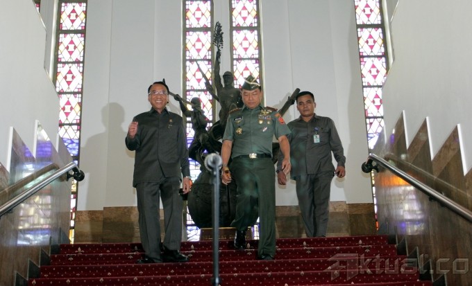 Menteri Energi dan Sumber Daya Mineral (ESDM) Jero Wacik (kiri) dan Panglima TNI Jenderal Moeldoko (kanan) saat menggelar Konfrensi Pers di Gedung ESDM, Jakarta, Selasa (10/9/2013). Pertemuan tersebut digelar untuk membahas masalah peningkatan kerjasama pengamanan obyek-obyek vital pertambangan di Indonesia. Aktual/Oke Dwi Atmaja