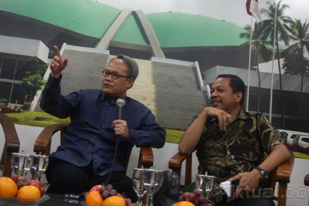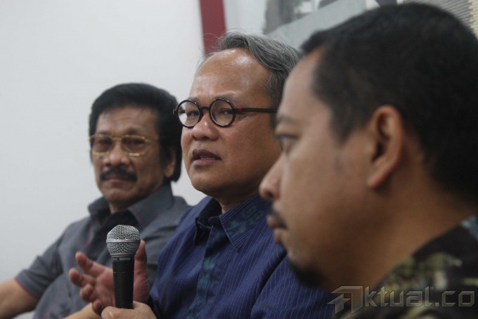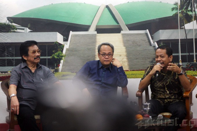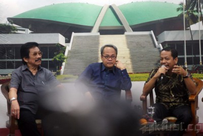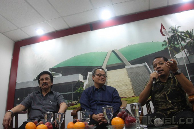 Ketua DPP Partai Golkar yang juga Wakil Ketua MPR Hajriyanto Y. Thohari (tengah) Wakil Ketua Dewan Pembina MKGR Zainal Bintang (kiri) dan Direktur Eksekutif Indo Barometer Muhammad Qodari (kana) menjadi pembicara dalam diskusi publik, di Gedung Parlemen, Jakarta, Kamis (21/11/2013). Diskusi ini menyoroti “Gejolak Politik” di tubuh Partai Golkar menjelang pelaksanaan Rapat Pimpinan Nasional (Rapimnas), terkait isu evalusi Pencapresan Ketua Umum Golkar Aburizal Bakrie (Ical) oleh sejumlah faksi karena Elektabilitasnya yang tidak meningkat. Aktual/Tino Oktaviano