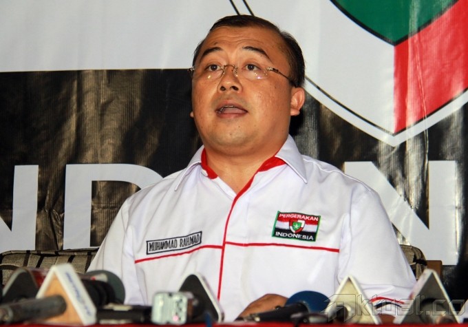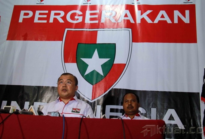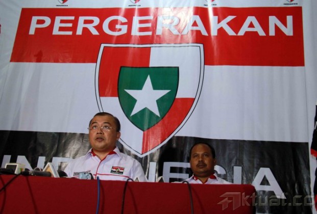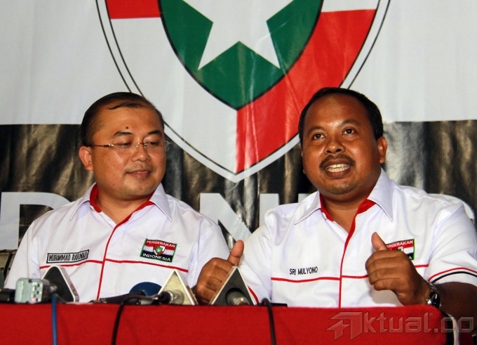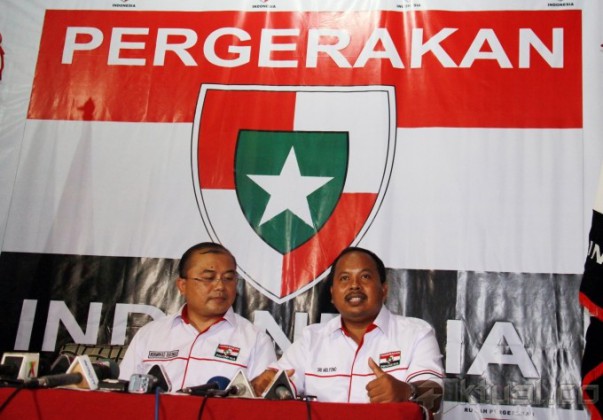 Moderator diskusi Perhimpunan Pergerakan Indonesia (PPI), M Rahmad (kiri) didampingi anggota tim PPI Sri Mulyono (kanan) menyampaikan bantahan membantah dirinya bersembunyi setelah menyebarkan informasi bahwa Prof Subur Budhisantoso (SBS) batal menjadi pembicara diskusi rutin PPI karena dijemput oleh Badan Intelejen Negara (BIN), di Markas PPI, Duren Sawit, Jakarta Timur, Minggu (20/10/2013). Aktual/Tino Oktaviano