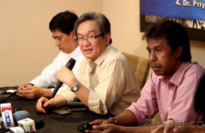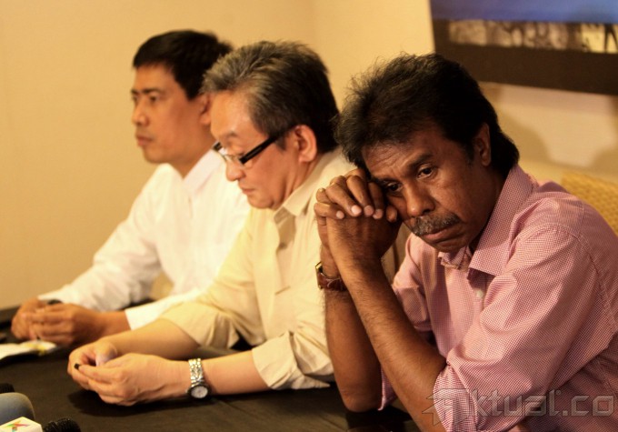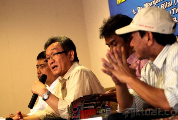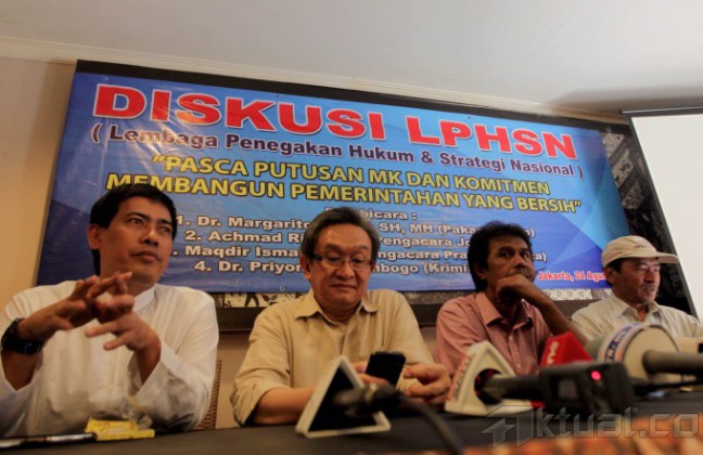 Kuasa hukum Prabowo-Hatta Maqdir Ismail (tengah) bersama kuasa hukum Jokowi-Jusuf Kalla Ahmad Rifai (kiri) dan pakar hukum Margarito Kamis menyampaikan tanggapan terkait putusan sengketa Pilpres oleh Mahkamah Konstitusi di Jakarta, Minggu (24/8/2014). Dalam acara diskusi yang bertema Pasca Putusan MK dan Komitmen Membangun Pemerintah Yang Bersih tersebut Koalisi Merah Putih menilai keputusan MK yang menolak seluruh gugatan mereka tidak mencerminkan keadilan substantif karena tidak memperhatikan bukti dan saksi secara mendalam. Aktual/Tino Oktaviano