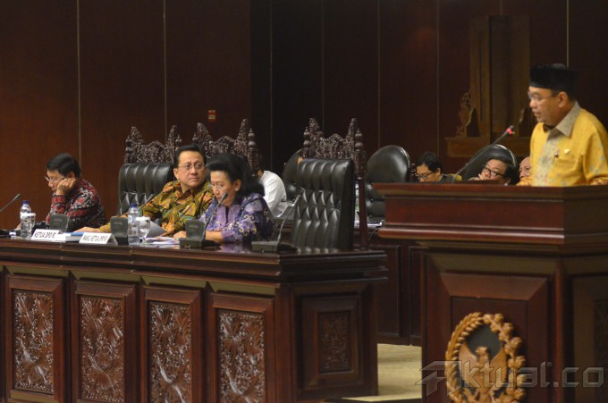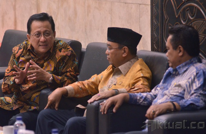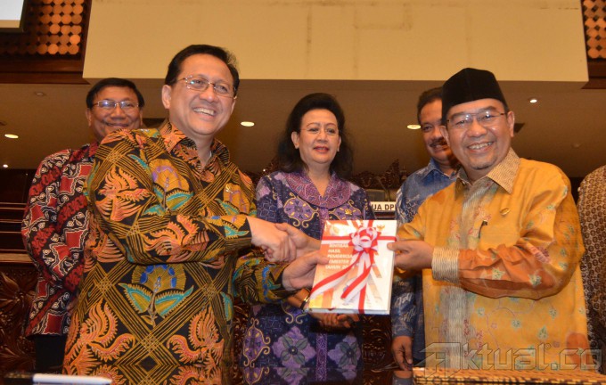 Dari kiri ke kanan, Ketua Dewan Perwakilan Daerah (DPD) Irman Gusman (kiri) dan Ketua Badan Pemeriksa Keuangan (BPK RI) Harry Azhar Azis (kanan) saat penyerahan ikhtisar hasil pemeriksaan BPK RI semester II tahun 2014 pada Sidang Paripurna DPD di Komplek Parlemen Senayan, Jakarta Selatan, Rabu (8/4/2015). Rapat paripurna tersebut beragendakan penyampaian ikhtisar hasil pemeriksaan BPK RI semester II tahun 2014 dan penyerahan laporan hasil AKTUAL/JUNAIDI MAHBUB