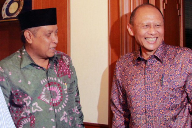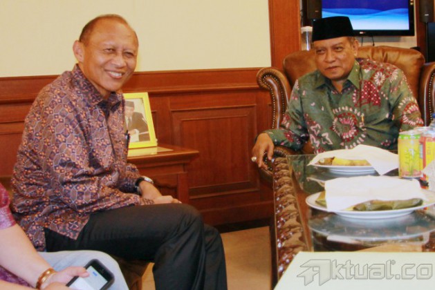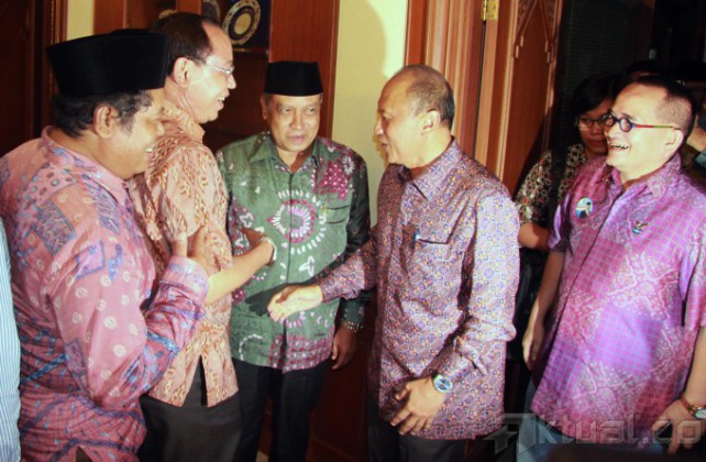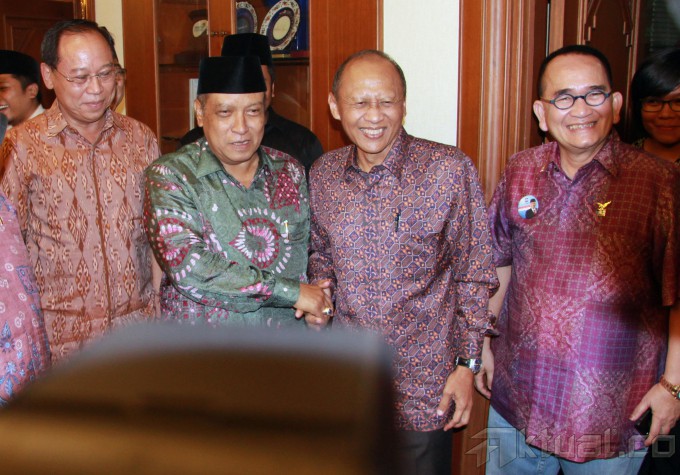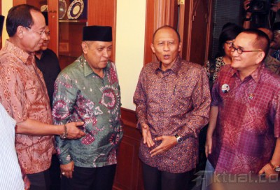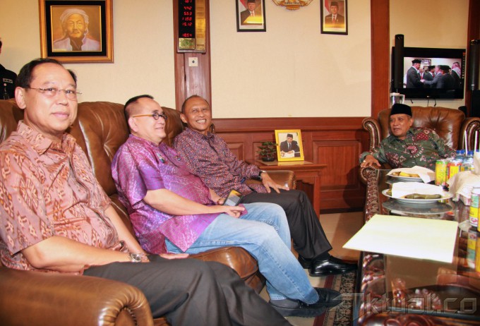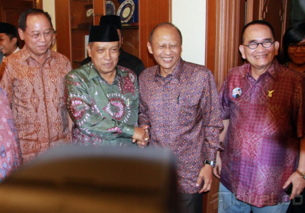 Ketua Umum Pengurus Besar Nahdlatul Ulama (PBNU), Said Aqil Siradj (kedua kiri), didampingi Dewan Pakar Partai Persatuan Pembangunan (PPP) Djan Faridz (kiri), menerima Calon Presiden konvensi Partai Demokrat, Pramono Edhie Wibowo (kedua kanan) yang didampingi Juru Bicara Partai Demokrat Ruhut Sitompul (kanan), di kantor PBNU, Jakarta, Rabu (30/4/2014). Menjelang Pemilihan Presiden, 9 Juli mendatang, markas PBNU banyak didatangi tokoh-tokoh politik. Kedatangan Pramono Edhi di PBNU kali ini untuk bersilaturahmi dan menjalin komunikasi politik dengan ketua PBNU. Aktual/Tino Oktaviano