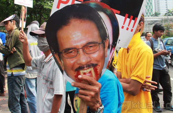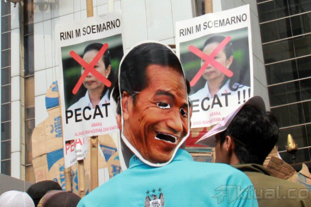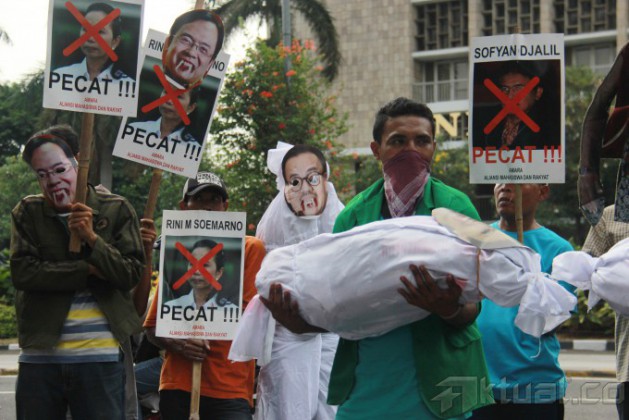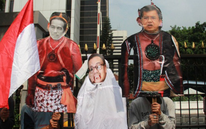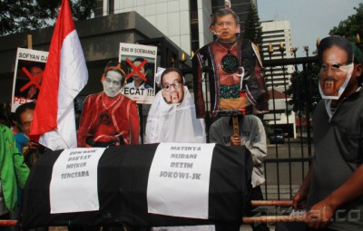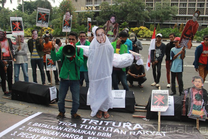 Pengunjuk rasa mengenakan topeng Presiden Joko Widodo, Wapres Jusuf Kalla, Menteri ESDM Sudirman Said, Menneg BUMN Rini Soemarno serta Menteri Perekonomian Sofyan Djalil, sambil membawa keranda mayat saat menggelar aksi di depan Kementerian ESDM, Jalan MH Thamrin, Jakarta, Kamis (27/11/2014). Aksi puluhan pengunjuk rasa yang mengatasnamakan Aliansi Mahasiswa dan Rakyat (AMARA) ini menuntut pembatalan kenaikan harga BBM dan memandang Pemerintah Jokowi-JK adalah antek – antek Neolib, mereka hanya memikirkan diri mereka sendiri bukan rakyatnya tapi mementingkan pihak asing. AKTUAL/TINO OKTAVIANO