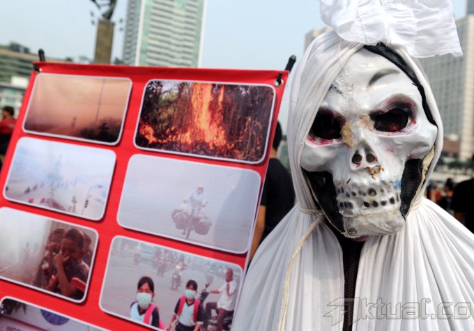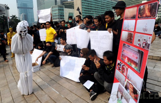 Seorang mahasiswa yang tergabung dalam Gerakan Mahasiswa Peduli Asap RIAU (GEMPAR) memakai kostum pocong saat menggelar aksi unjuk rasa di Bundaran Hotel Indonesia, Jakarta, Minggu (16/3/2014). Mereka menuntut Pemerintah untuk mempercepat proses pengentasan kabut asap di Riau. Aktual/Tino Oktaviano