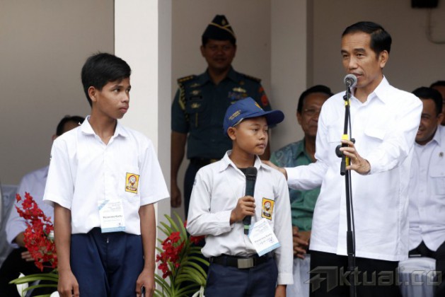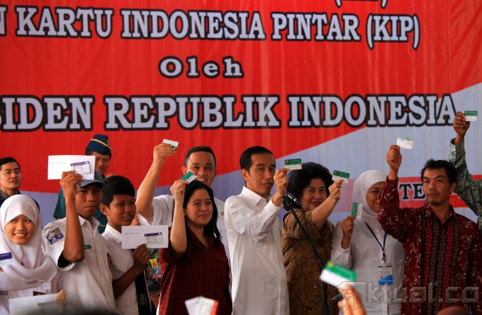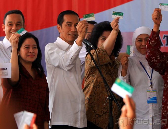 Presiden Joko Widodo (ketigakiri) didampingi Menteri Pendidikan dan Kebudayaan Anies Baswedan (kiri), Menteri Koordinator bidang Pembangunan Manusia dan Kebudayaan Puan Maharani (kedua kiri), Menteri Kesehatan Nila F. Moeloek (kedua kanan) dan Menteri Sosial Khofifah Indar Parawangsa (kanan) menujukkan Kartu Indonesia Sehat (KIS) di SDN 2 Temuwangi Pedan, Klaten, Jawa Tengah, Senin (4/5). Pada kesempatan itu Presiden secara simbolis menyerahkan sebanyak 532 Kartu Keluarga Sejahtera (KKS), 447 Kartu Indonesia Pintar (KIP), dan 1.646Kartu Indonesia Sehat (KIS) untuk wilayah Temuwangi. ANTARA FOTO/Maulana Surya