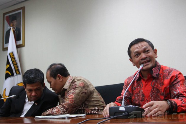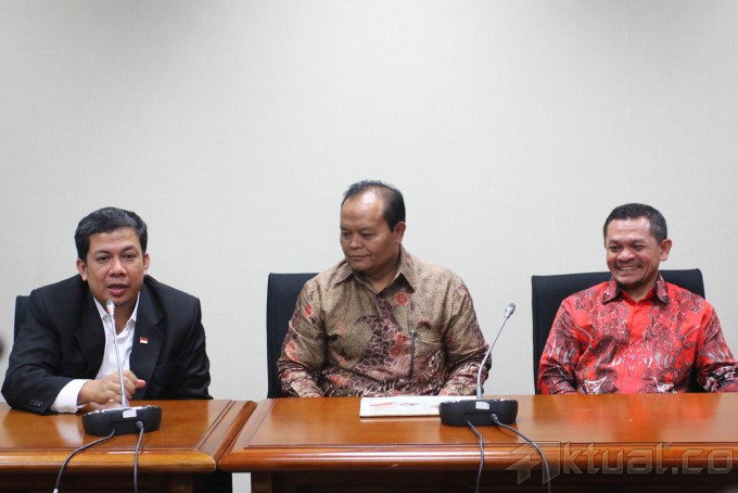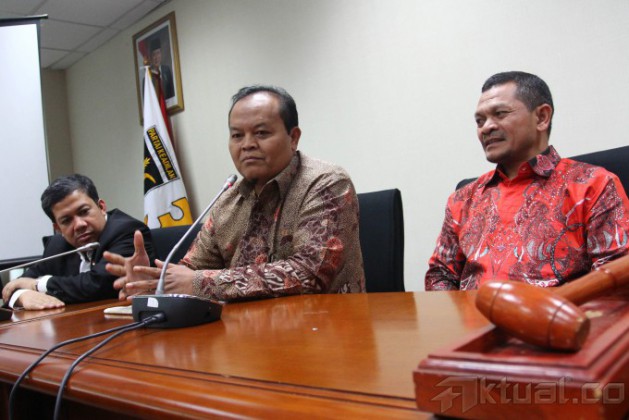 Ketua Fraksi PKS DPR Hidayat Nur Wahid (tengah) didampingi Anggota Komisi III DPR Fraksi PKS Fahri Hamzah (kiri) dan Kuasa Hukum Luthfi Hasan Ishaq (LHI) Zainuddin Paru (kanan), menggelar konferensi pers, di Gedung Parlemen, Jakarta, Selasa (10/12/2013), terkait vonis mantan Presiden Partai Keadilan Sejahtera (PKS) Luthfi Hasan Ishaaq. PKS menyatakan Vonis 16 tahun terhadap LHI dinilai bentuk penzaliman dan tidak adil karena tidak sebanding dengan vonis yang dijatuhkan kepada terdakwa kasus ynag lebih besar seperti Century, Hambalang dan SKK Migas, sementara banyak bukti kebenaran tidak ditampiilkan sebagai fakta hukum selama persidangan. Aktual/Tino Oktaviano