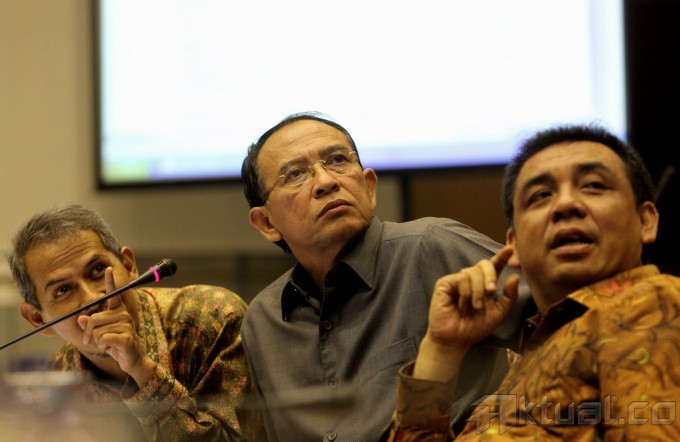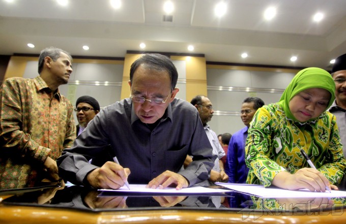 Menteri Agama Suryadharma Ali bersama Dirjen Haji dan Umroh Kementerian Agama Anggito Abimanyu dan Ketua Komisi VIII DPR RI Ida Fauziah saat rapat kerja di Gedung Parlemen, Senayan, Jakarta, Senin (3/3/2014). Pemerintah dan DPR menyetujui Biaya Penyelenggaraan Ibadah Haji (BPIH) atau Ongkos Naik Haji (ONH) tahun 2014/1435 H rata-rata sebesar 3.219 dollar AS atau turun sebesar 308 dollar AS dibandingkan tahun 2013/1434 H yaitu 3.527 dollar AS. Aktual/Tino Oktaviano