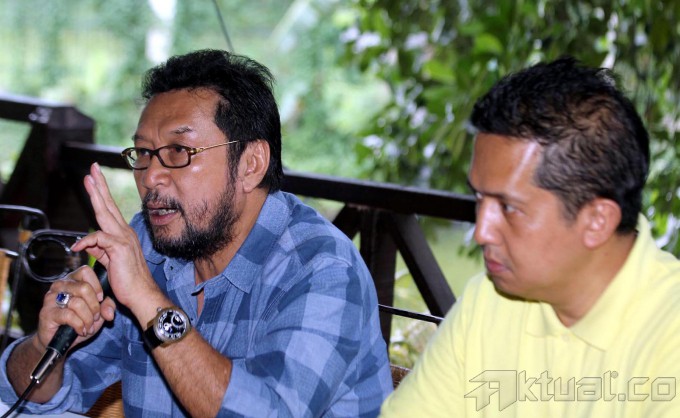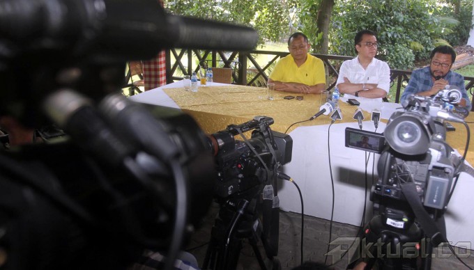 Ketua Umum Angkatan Muda Partai Golkar (AMPG) Yorrys Raweyai (kanan kedua) bersama Sekjen AMPG Muhammad Sarmuji (kiri), Wakil Ketua Umum AMPG Tantowi Yahya (kedua kiri) dan Ketua AMPG Pahlevi Pangeran memberikan keterangan pers saat mengelar jumpa pers terkait respon terhadap hasil pemilu legislatif 2014 di Jakarta, Sabtu (19/4/2014). AMPG merespon Kegagalan dan kekalahan Partai Golkar dalam memenuhi target perolehan suara 25-26 persen dalam pemilu Legislatif 2014 memerlukan respon yang serius dari DPP Partai Golkar. Aktual/Tino Oktaviano