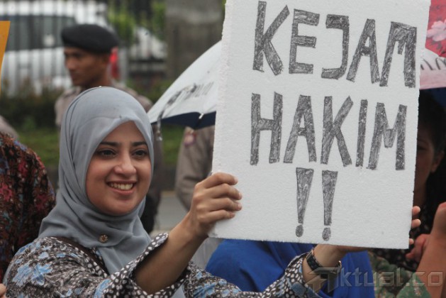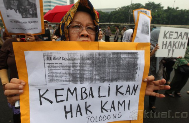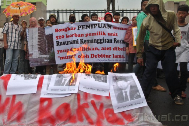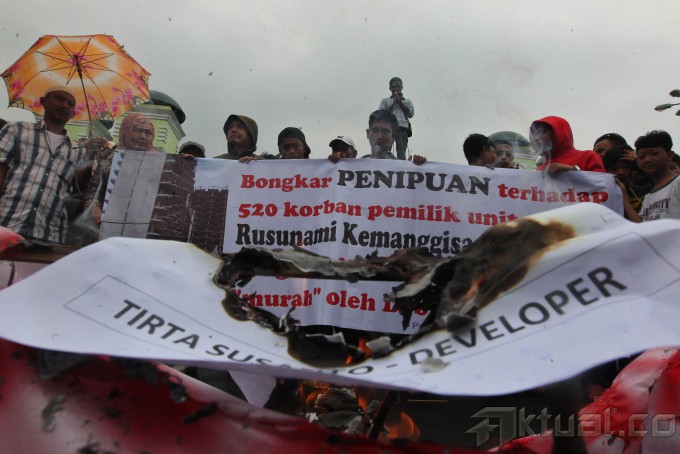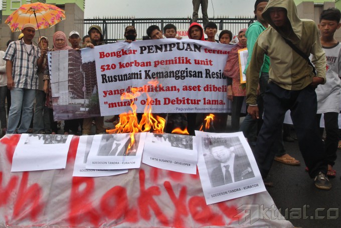 Warga calon penghuni rusunami yang tergabung dalam Paguyuban Rusunami Kemanggisan Residence membakar poster saat berunjuk rasa di depan Gedung DPR, Kompleks Parlemen Senayan, Jakarta, Kamis (27/2/2014). Mereka menuntut pemerintah membongkar penipuan terhadap 500 korban pemilik unit rusunami kemanggisan yang dipailitkan. Aktual/Tino Oktaviano