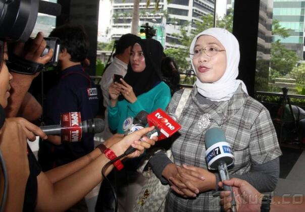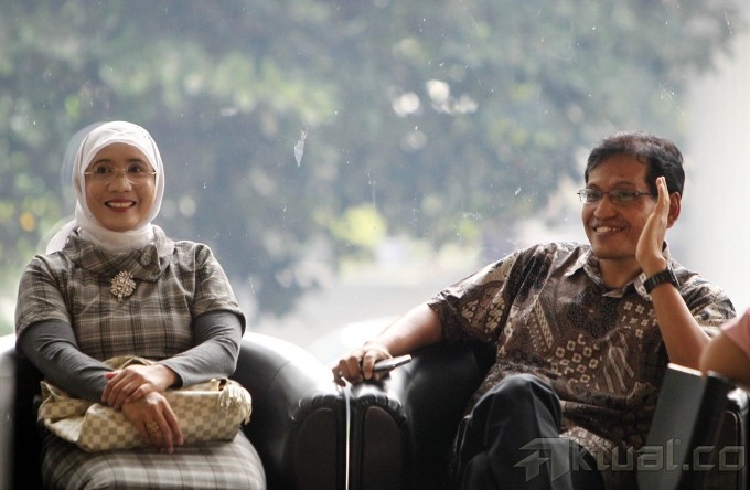 Wakil Sekjen Partai Demokrat Andi Nurpati (kiri) berbincang dengan Ketua Pusat Pengembangan Strategi dan Kebijakan DPP Partai Demokrat Ulil Abshar Abdalla di Gedung KPK, Jakarta, Kamis (31/10/2013). Andi Nurpati dan Ulil Abshar Abdalla datang membesuk mantan Menpora Andi Mallarangeng yang ditahan oleh KPK untuk kasus dugaan korupsi proyek Pusat Pendidikan, Pelatihan dan Sekolah Olahraga Nasional (P3SON) Hambalang. Aktual/Tino Oktaviano
