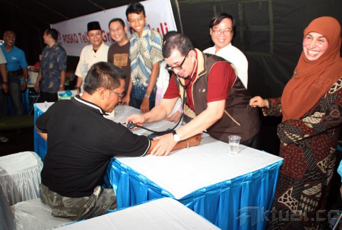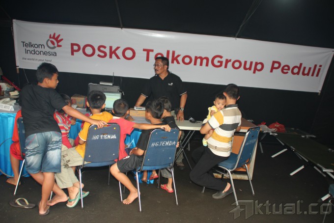 Menteri Sosial Republik Indonesia (Mensos RI) Salim Seggaf Al Jufri (tengah) didampingi VP Public Relation PT Telkom Arif Prabowo (kedua kiri), meninjau tim medis yang melayani pengungsi saat meninjau Posko Telkom Group Peduli di di Gelanggang Olah Raga (GOR) Otista, Jatinegara, Jakarta Timur, Minggu (19/1/2014). Posko Telkom Peduli ini dilengkapi CCTV pemantau pintu air Katulampa, Depok dan Manggarai untuk para pengungsi yang ingin melihat situasi ketiga pintu air tersebut. Aktual/Tino Oktaviano