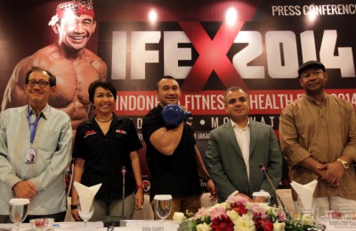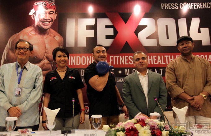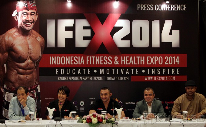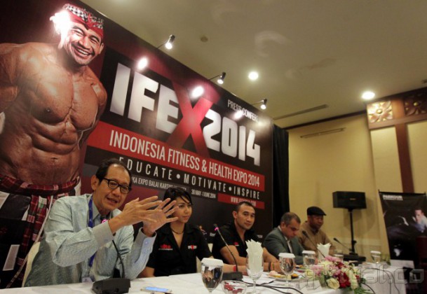 Dari kiri ke kanan, Founder MarcPlus Inc Jakarta Hermawan Kertajaya, CEO Elite Group Jakarta Dina Carol, Director Of Elite Event Management Kadek Edy Sastradi, Country Manager Fitness First Jakarta Anil Chugani dan High Commisioner Of The Republic Of Seychelles Waven Willian (kiri kekanan) berbincang usai mengelar jumpa pers Indonesia Fitness & Health Expo (IFEX) 2014 di Jakarta, Selasa (18/3/2014). Pameran IFEX 2014 bertema “Educate, Motivate, Inspire” tersebut merupakan perhelatan akbar dunia kebugaran dan kesehatan yang akan digelar pada 30 Mei 2014. Aktual/Tino Oktaviano