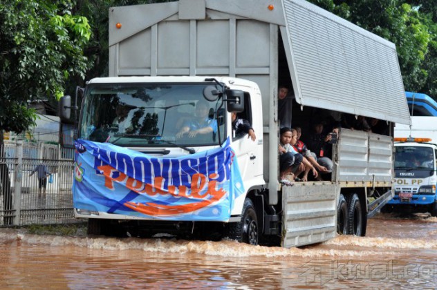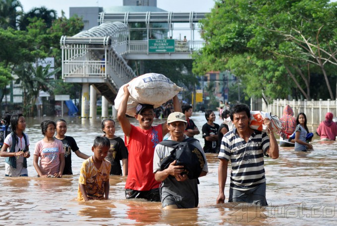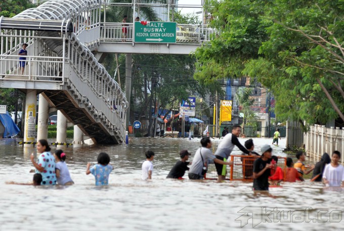 Warga menuntun sepeda motor saat melintasi banjir di Jalan Panjang, Grand Garden, Kedoya, Jakarta Barat, Selasa (10/2/2015). Banjir yang merendam jalan panjang dan perumahan Grand Garden ini melumpuhkan aktifitas warga dan pengguna jalan. AKTUAL/JUNAIDI MAHBUB