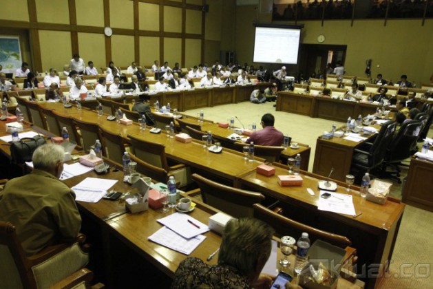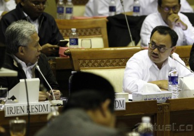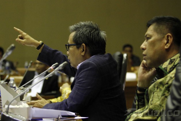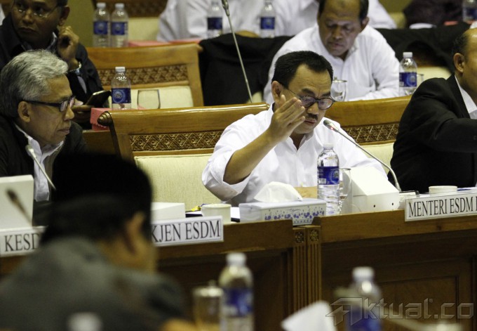 Menteri ESDM Sudirman Said menyimak pertanyaan angota Komisi VII DPR saat rapat kerja di Kompleks Parlemen, Jakarta, Selasa (9/5). Salah satu agenda rapat tersebut yakni guna membahas polemik pembubaran Petral. AKTUAL/JUNAIDI MAHBUB