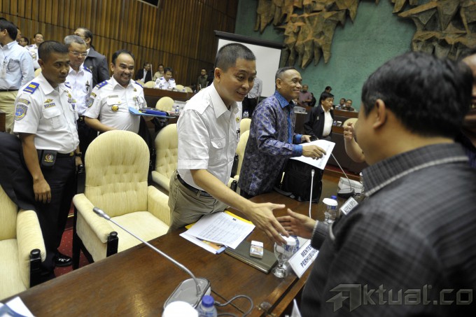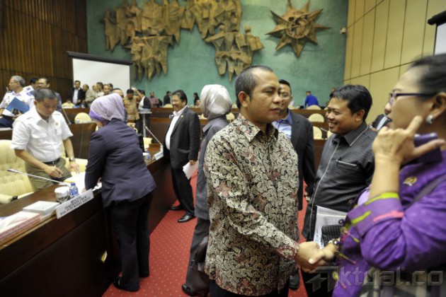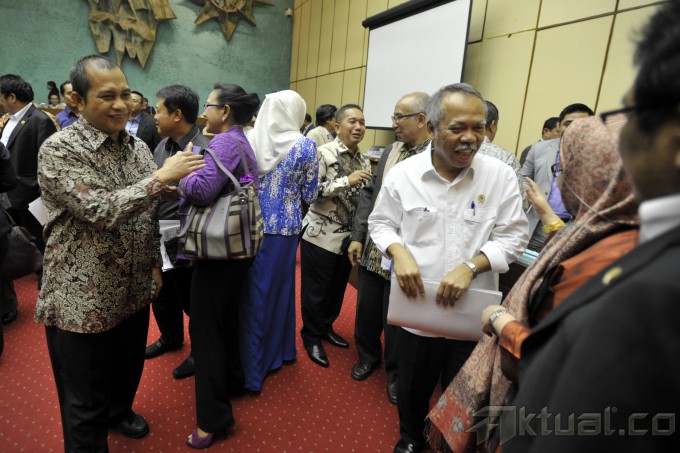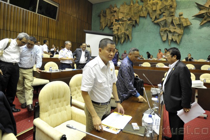 Menteri Desa, Pembangunan Daerah Tertinggal dan Transmigrasi Marwan Jafar (ketiga kanan) dan Menteri Perhubungan Ignasius Jonan (kiri), berbincang dengan anggota dewan seusai menghadiri rapat kerja gabungan dengan Komisi V DPR di Kompleks Parlemen, Senayan, Jakarta, Kamis (12/2). Komisi V DPR menyetujui usulan anggaran empat Kementerian/Lembaga senilai Rp192,626 triliun dalam Rancangan Anggaran Pendapatan dan Belanja Negara Perubahan (RAPBN-P) dalam rapat yang dihadiri Kementerian Perhubungan; Kementerian PU dan Perumahan Rakyat; Kementerian Desa, Pembangunan Daerah Tertinggal, dan Transmigrasi dan BMKG. ANTARA FOTO/Ismar Patrizki