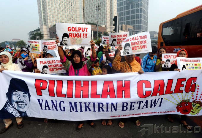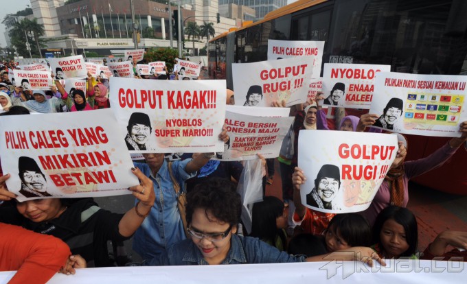 Puluhan ibu-ibu yang tergabung dalam Forum Rakyat Betawi Pendukung Caleg Bersih melakukan aksi damai di Bundaran Hotel Indonesia, Jakarta, Minggu (16/3/2014). Mereka meminta masyarakat Jakarta pada khususnya untuk tidak golput dan memilih caleg yang bersih dari korupsi. Aktual/Tino Oktaviano
