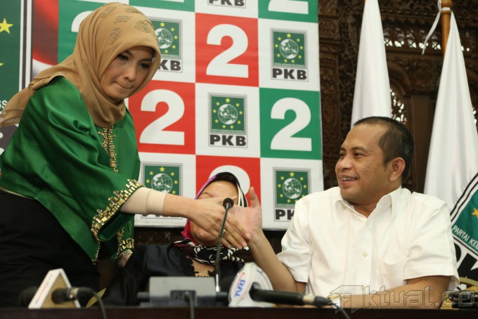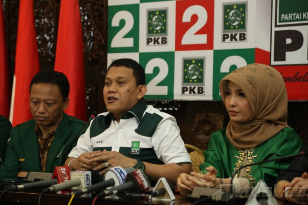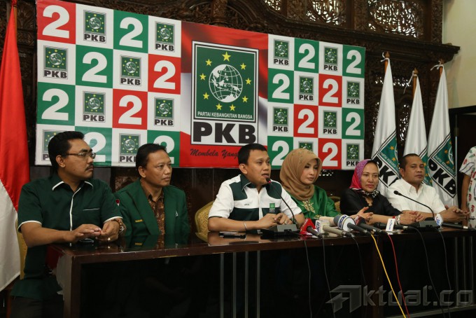 Ketua DPP PKB Abdul Kadir Karding (kiri) bersama artis yang juga politisi PKB Arzeti (kedua kiri), Ketua Perempuan PKB Ana Muawanah (kedua kanan) dan Ketua DPP Marwan Jafar (kanan) saat memberikan keterangan pers jelang muktamar PKB di Jakarta, Selasa (12/8). Partai Kebangkitan Bangsa (PKB) akan menggelar muktamar di Surabaya pada 30-31 Agustus 2014 dengan tema Politik Rahmatan Lil alamin. Aktual/Junaidi Mahbub