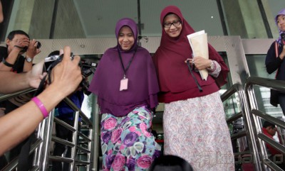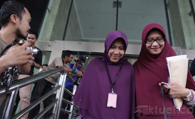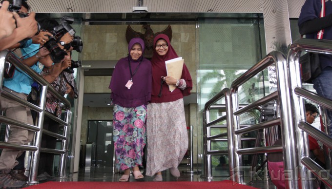 Athiyyah Laila (kanan) saat akan menjenguk suaminya, Anas Urbaningrum yang ditahan di Rutan KPK, Jakarta, Kamis (13/2/2014). Anas ditahan penyidik dalam kasus dugaan suap terkait proyek pembangunan Pusat Pendidikan, Pelatihan dan Sekolah Olahraga Nasional (P3SON) Hambalang. Aktual/Tino Oktaviano
