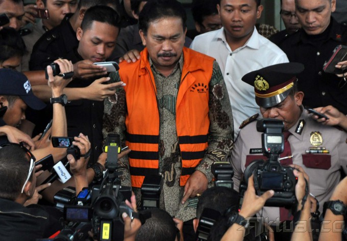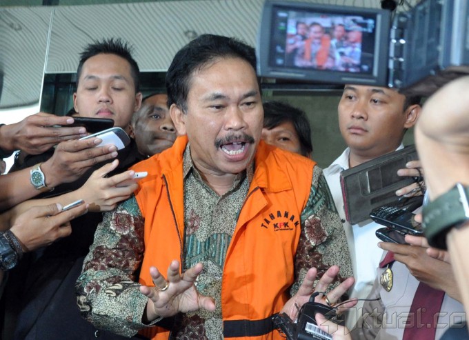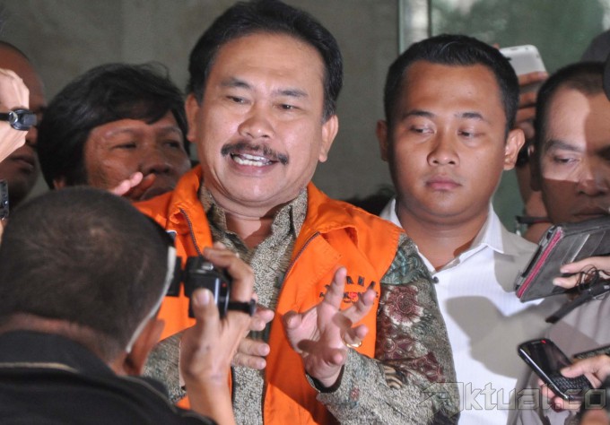 Tersangka kasus suap pengurusan sengketa Pilkada di MK, Raja Bonaran Situmeang, sebelum dimasukan kedalam mobil tahanan KPK di Jakarta, Senin (6/10/2014). Bupati Tapanuli Tengah ini langsung ditahan di Rutan Guntur usai menjalani pemeriksaan selama 7 jam. AKTUAL/JUNAIDI MAHBUB